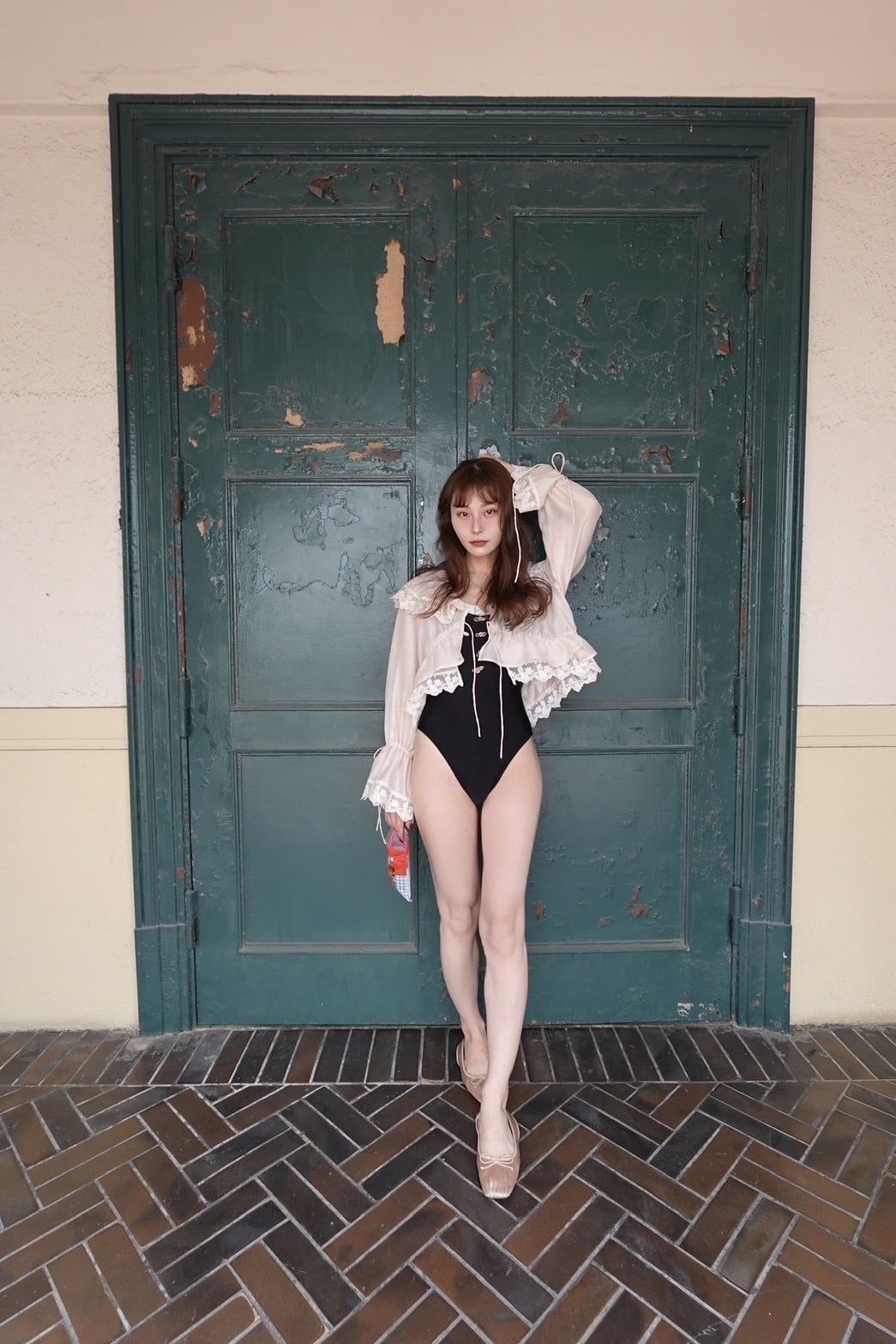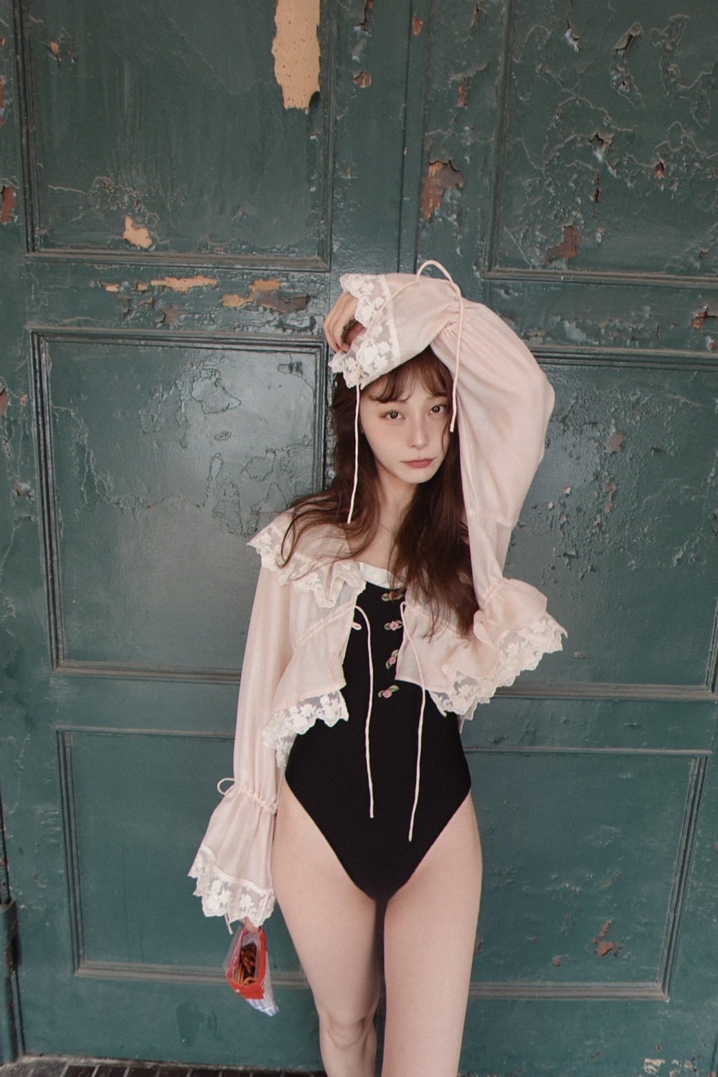 Rose swim suit..♡ ラインの美しいブラックの水着に、 胸元にローズアップリケと、アイボリーのフリル。 バックスタイルはボリューミーなリボンを締めて。 セクシーなラインで、オトナのフリルを♡ 肩紐調整、リボンにてバスト調整をしていただけます♡ 上質な素材を使用し、撥水性も◎ 着丈 肩から63cm〜伸縮あり、肩紐調整あり 背中リボンの為バストやウエストのサイズは調整可。パットホルダーあり model 160m