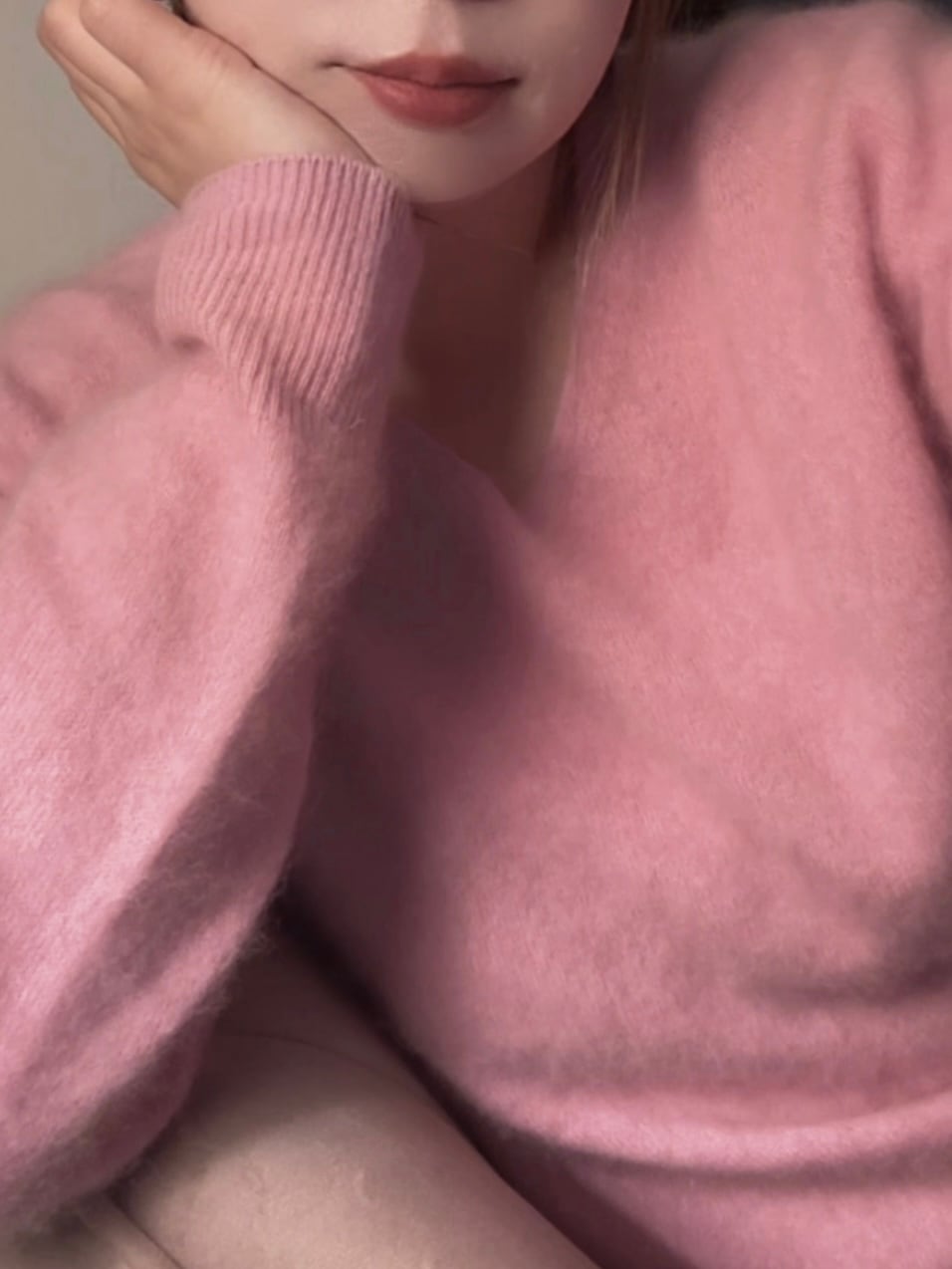 CASHMERE KNIT ふんわりとしたピンクのカシミアニットは、柔らかくて心地よい肌触り。 深すぎないVネック、厚すぎず軽やかなのにしっかり暖かい AURA DRESS に重ねても、 デニムに合わせても♡ cashmere 5% wool 95% 着丈61 cm 身幅 55cm