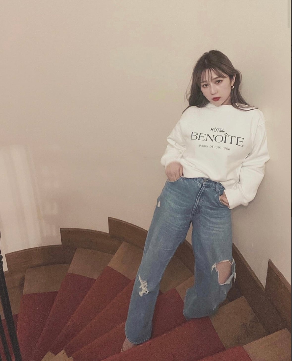 顔切りのデニムコーデの写真は、150cmのモデルによる着用写真です。