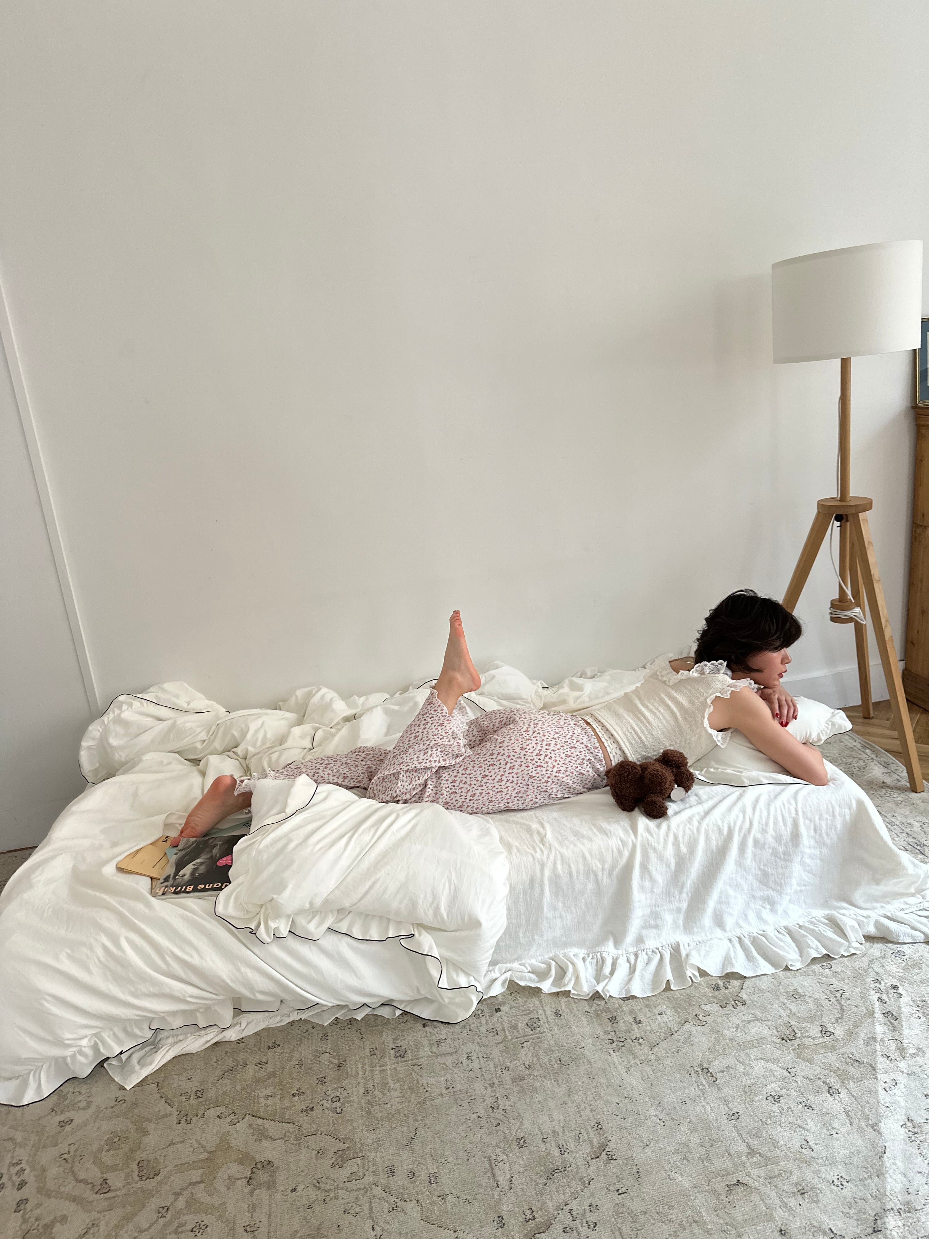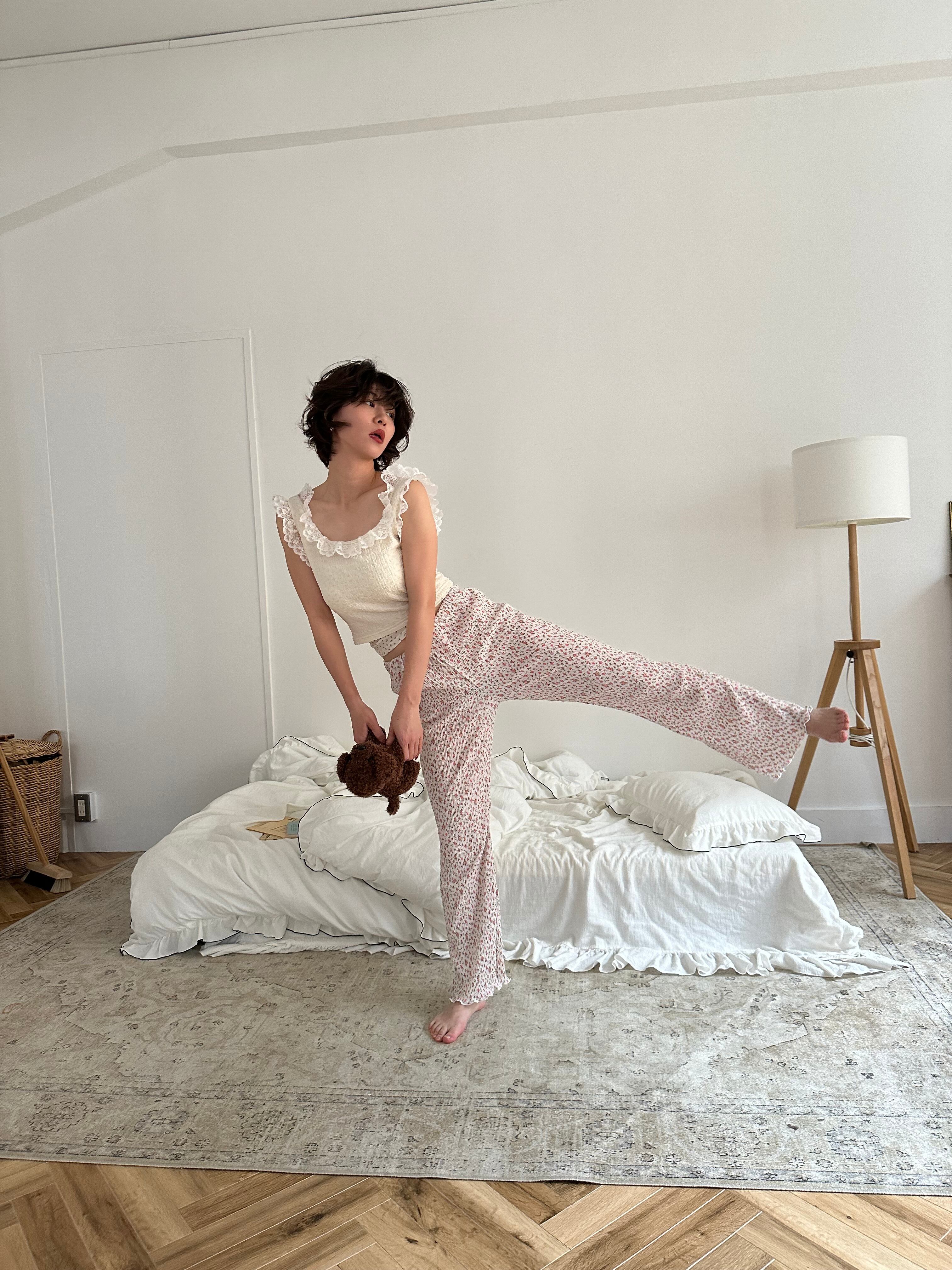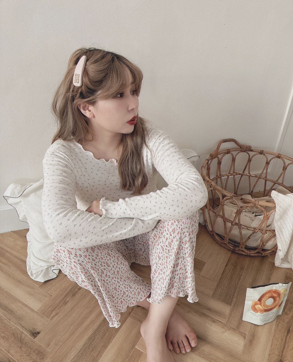 着心地の良い生地で小花柄 プリーツでウエストはゴム 裾はメロウになっていてかわいいパンツ。 普段着や、お部屋着はもちろん ヨガ、ピラティス時にスタッフは着用しております。 サイズ ウエスト56〜128 着丈95 polyester 100%